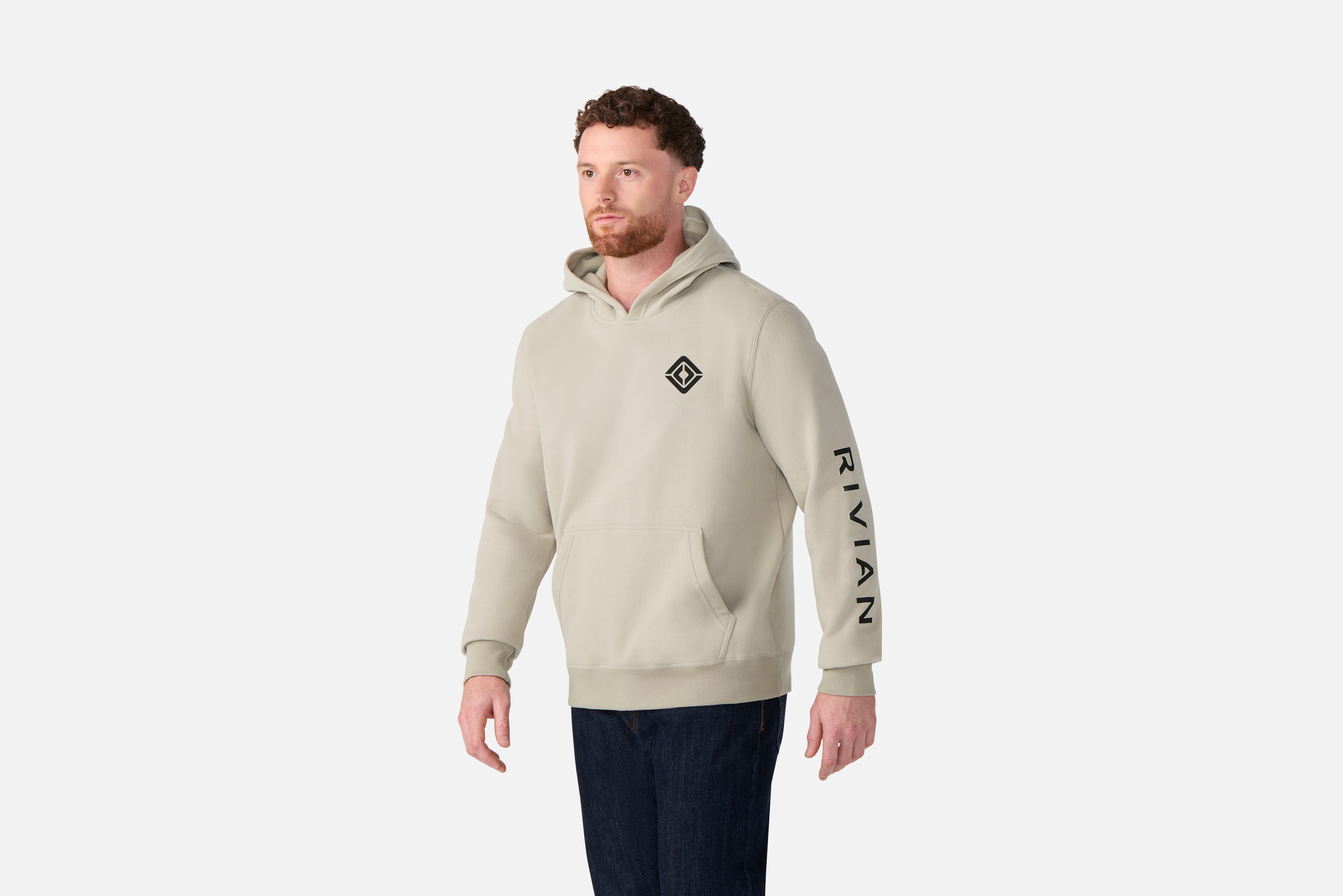 - Compass logo on left chest and Rivian wordmark on left sleeve