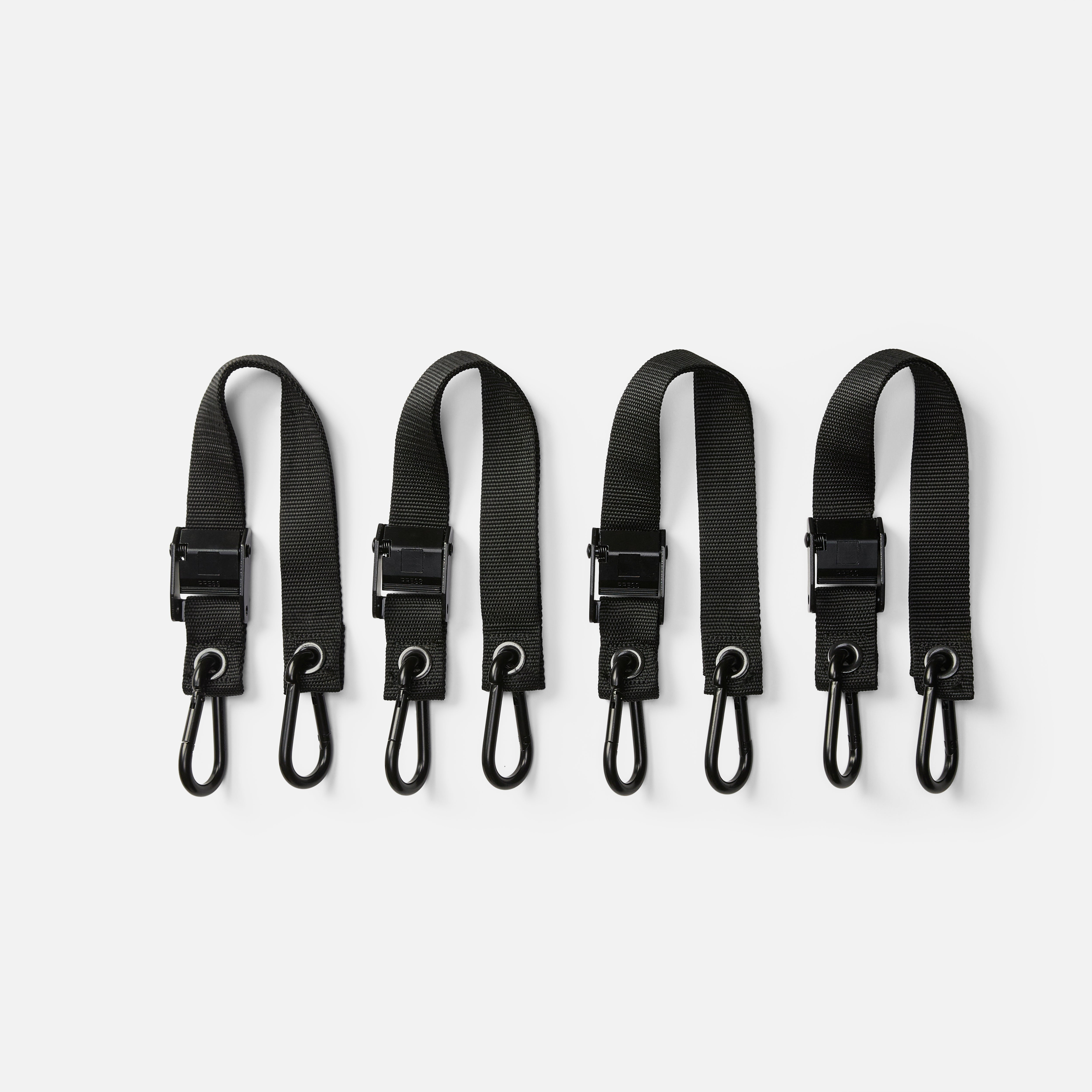 - Four adjustable tie‑down straps with carabiners hook into the D-rings or accessory ports