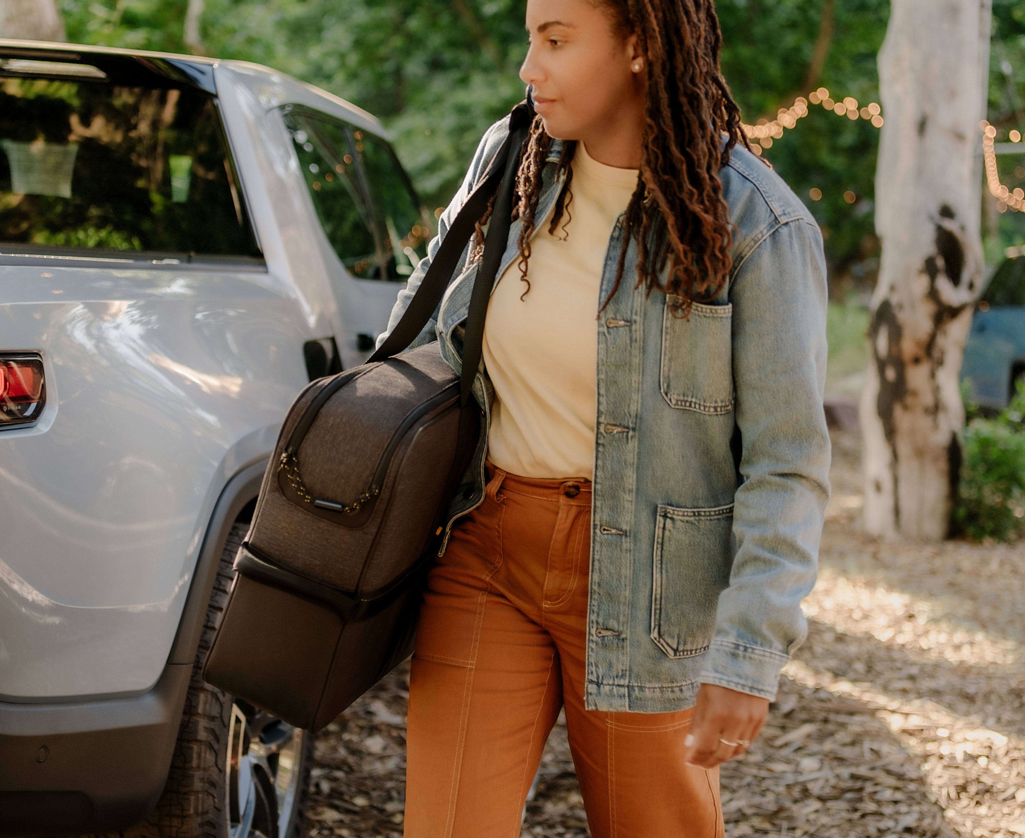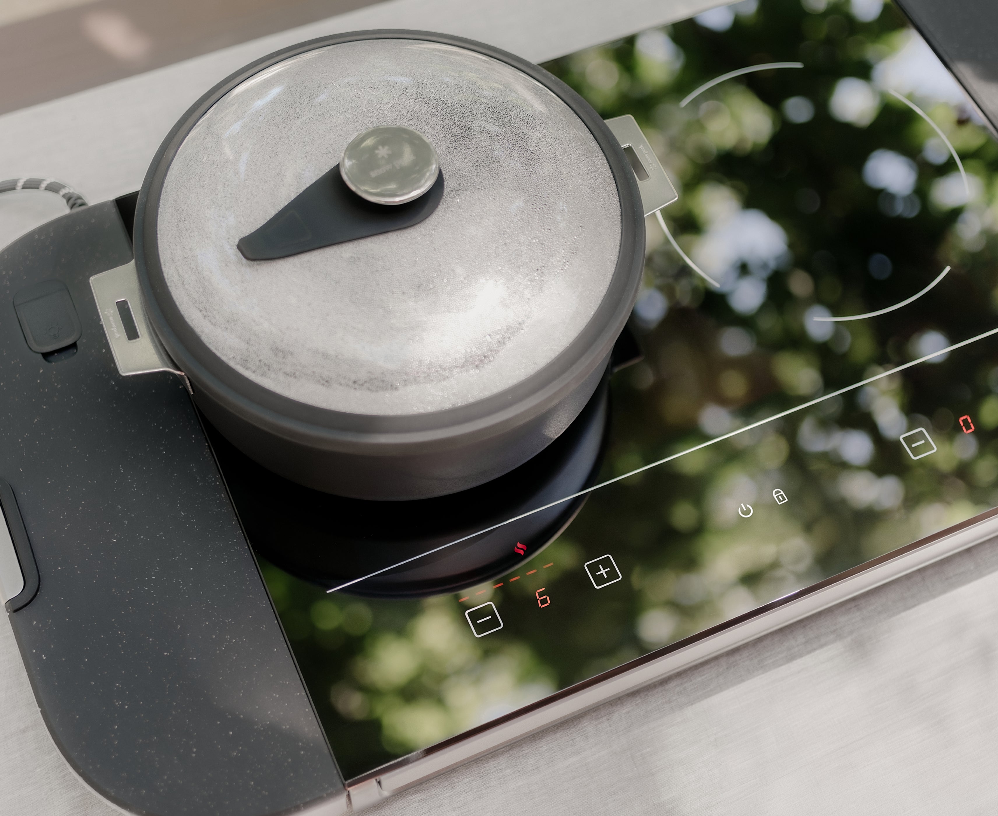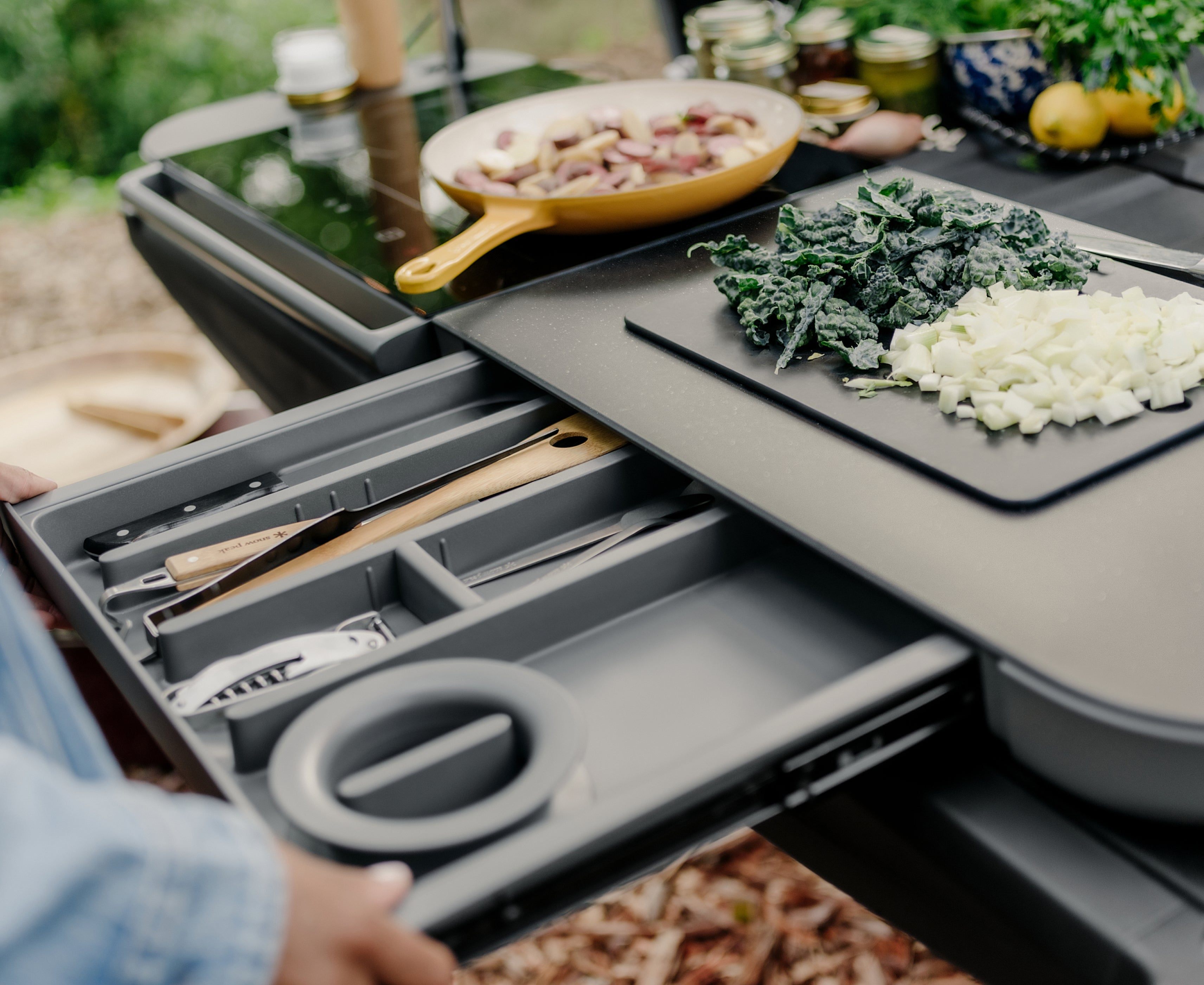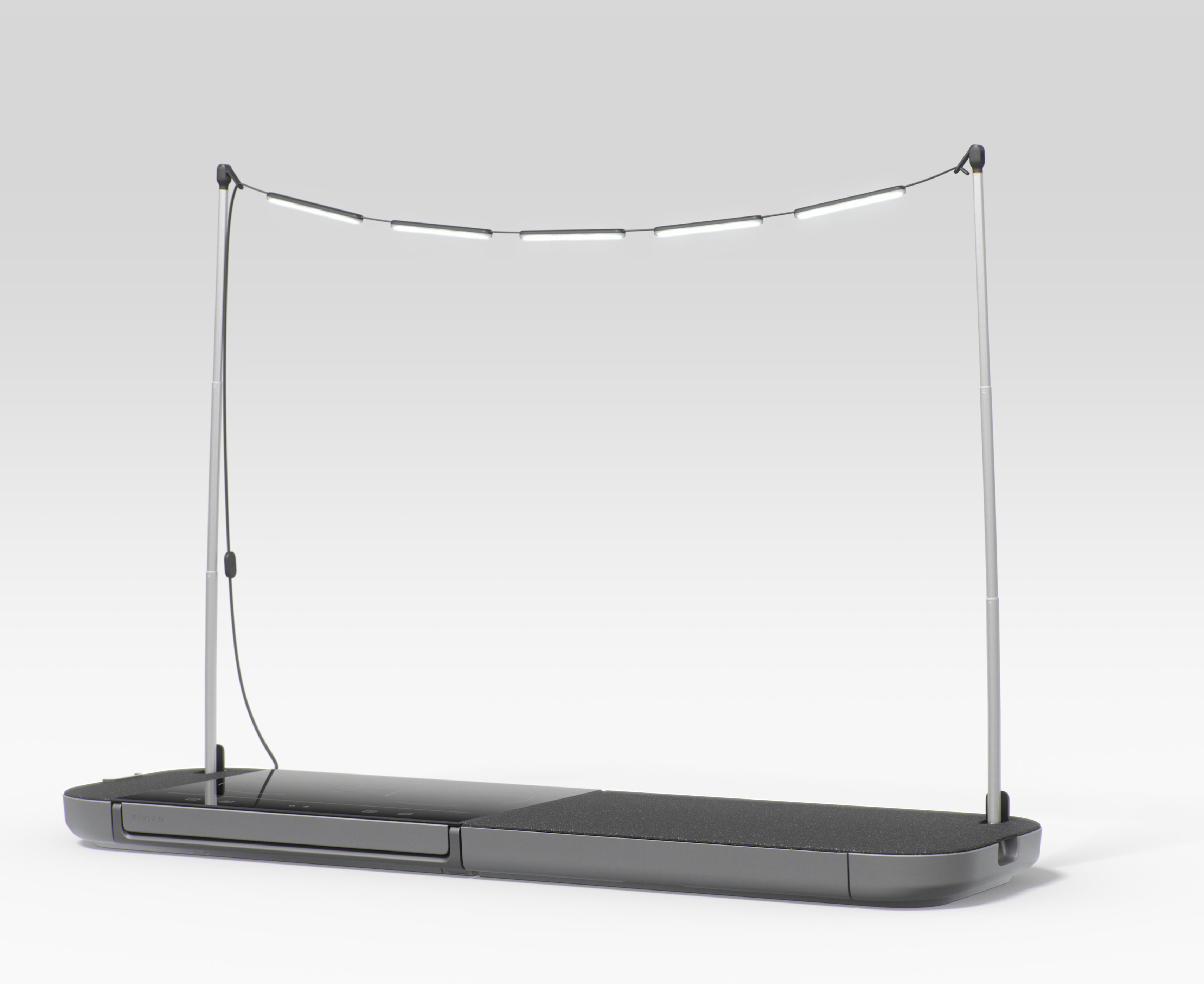 Designed in-house by Rivian, this 2-burner induction cooktop, food prep surface and storage space is built specifically for your R1 and beyond.